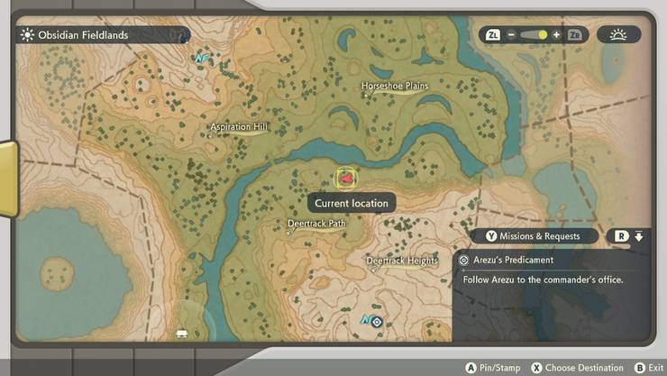 Bahan-bahan di Aspiration Hill dan Horseshoe Plains adalah apricorn, daun bawang obat, batu jatuh, dan buah beri. Setelah pelatih mengembangkan cerita dan mengalahkan Mai, mereka akan dapat menjelajahi lebih banyak Obsidian Fieldlands. Mereka akan melihat bahwa bagian yang tersisa dari Obsidian Fieldlands sangat bergunung-gunung dan bisa sulit untuk didaki sampai mereka membuka Wyrdeer. Lebih banyak sumber daya juga menjadi terbuka untuk pelatih seperti potongan besi dan, tentu saja, kayu.