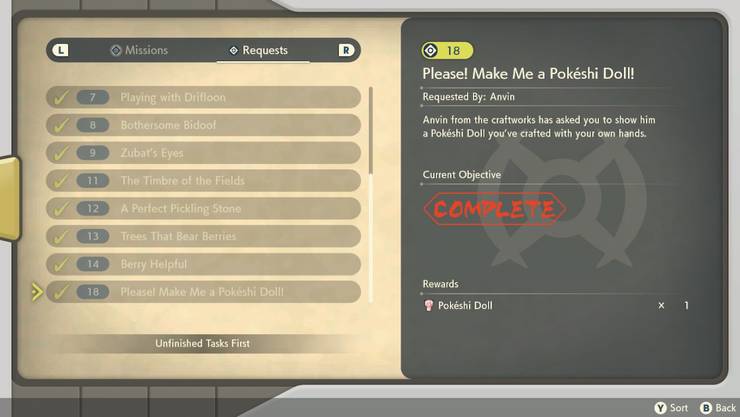 Setelah pelatih semakin dekat untuk membuka sisa Dataran Dataran Obsidian, mereka akan dapat menerima lebih banyak permintaan. Salah satu permintaan ini disebut "Tolong! Buatkan saya Boneka Pokeshi!" Bicaralah dengan pemilik toko kerajinan di Desa Jubilife untuk menerima permintaan tersebut. Dia akan menginginkan tiga batang kayu dan memberi Rei/Akari resep untuk membuat Boneka Pokeshi. Buat Boneka Pokeshi dengan kayu, dan dia akan menyerahkan Boneka Pokeshi miliknya sebagai ucapan terima kasih.