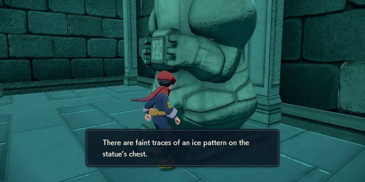 Setelah mengikuti penanda pencarian beberapa langkah, pemain akan menemukan kemajuan mereka dihentikan oleh pintu terkunci dengan tiga panel dipasang ke dalamnya. Ini adalah panel mana yang ingin mereka tekan terlebih dahulu. e panel mewakili tiga elemen dari trio Titan Legendaris asli: Batu, Es, dan Baja. Mereka juga akan menerima petunjuk samar yang berbunyi "Layulah tatapan patung..." sebelum ditanya